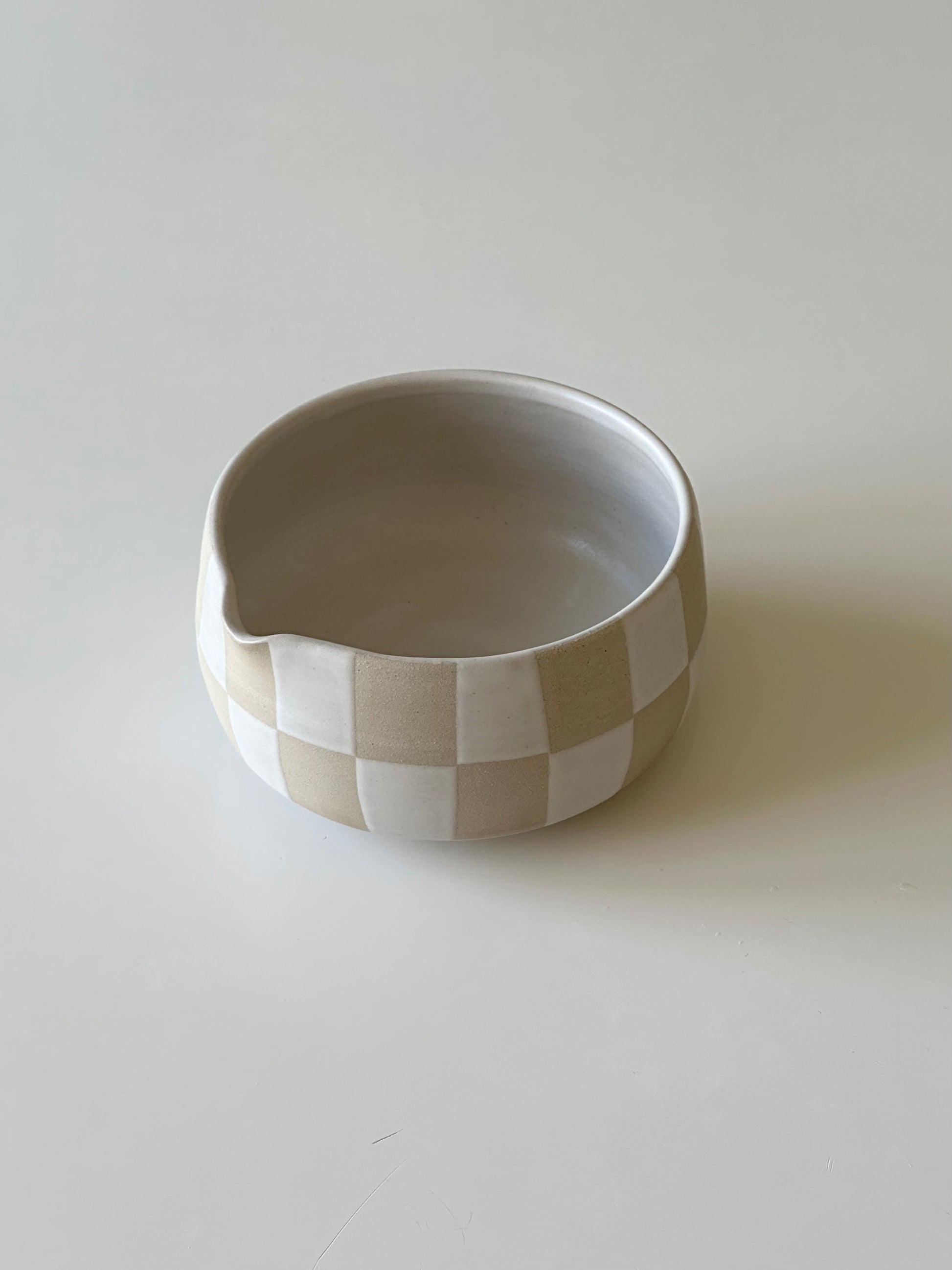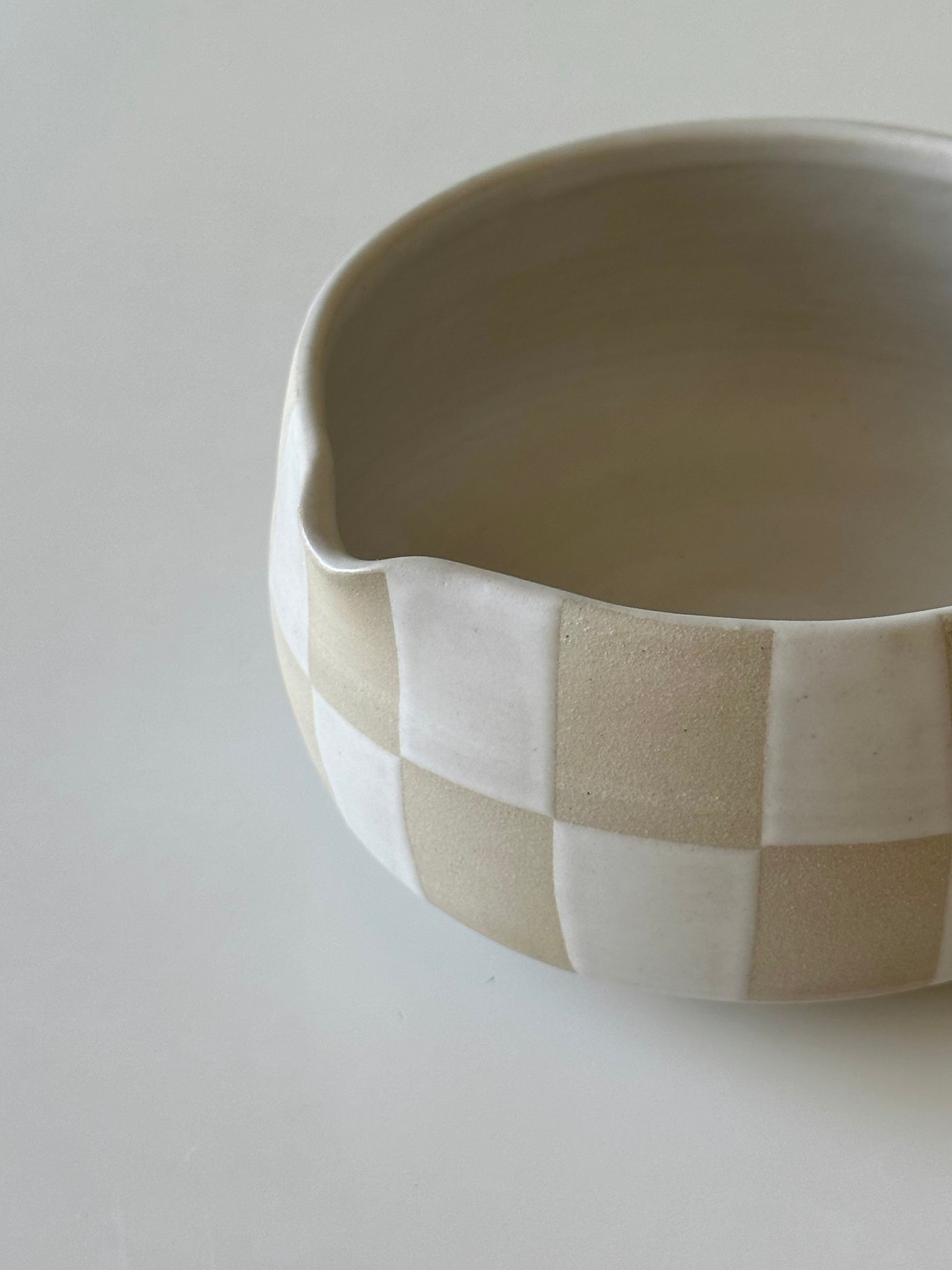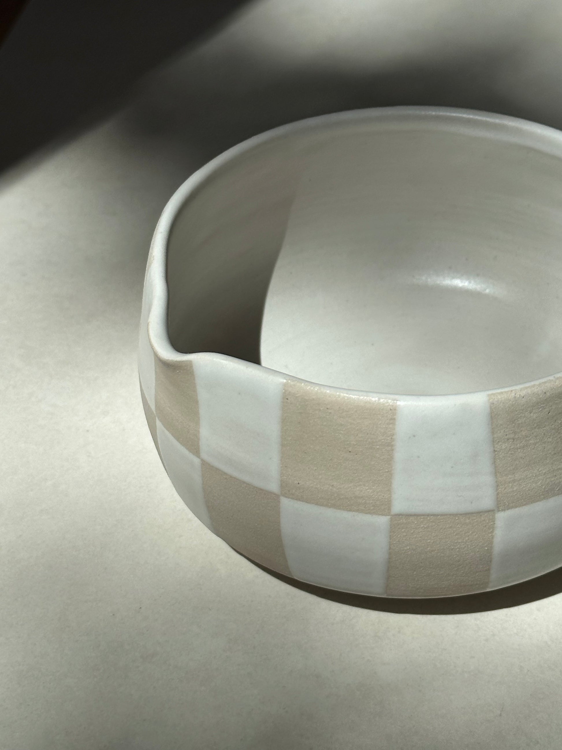 Introducing our limited edition sand checkered matcha bowl created in collaboration with Chantal from Studio à la Cave, based in Biel/Bienne, Switzerland. Each bowl is carefully crafted and painted by hand, making each a one-of-a-kind piece with its own distinct character.